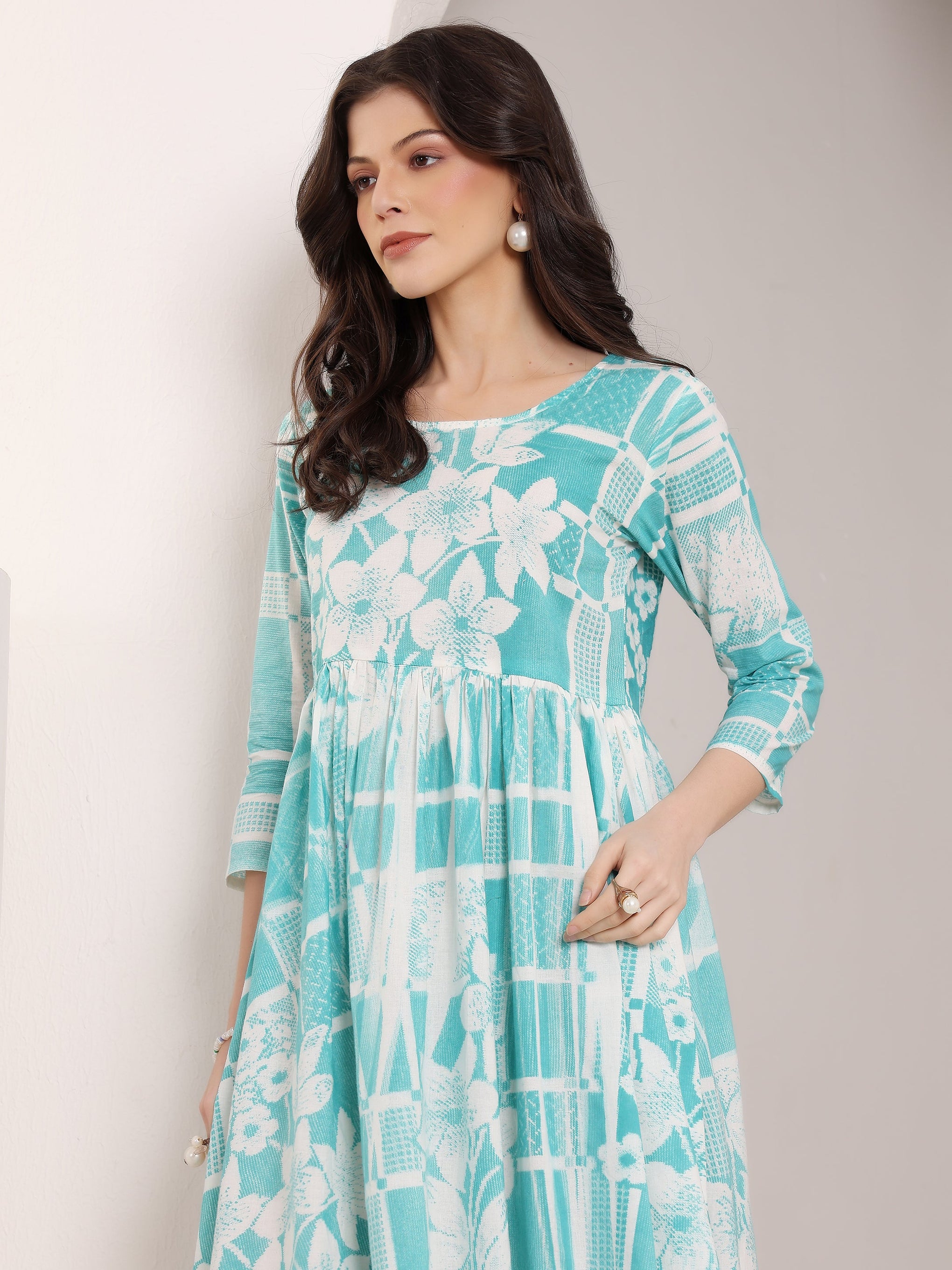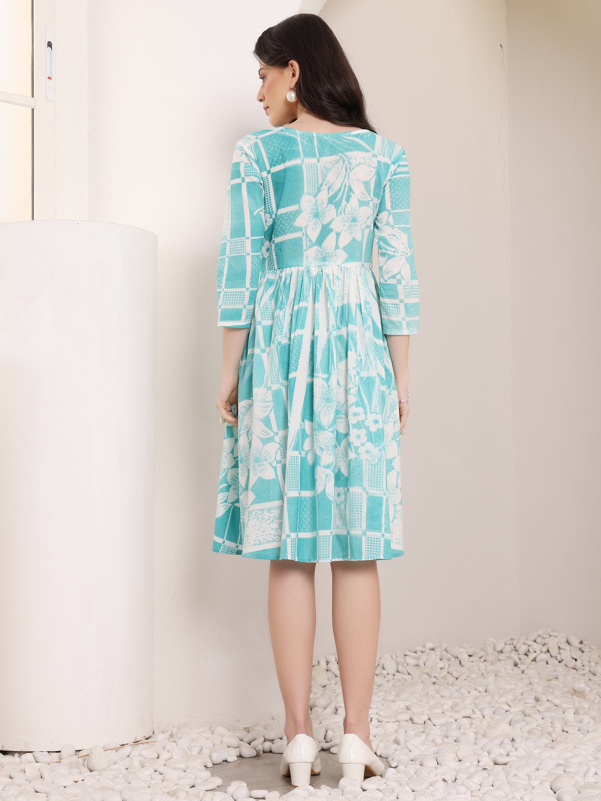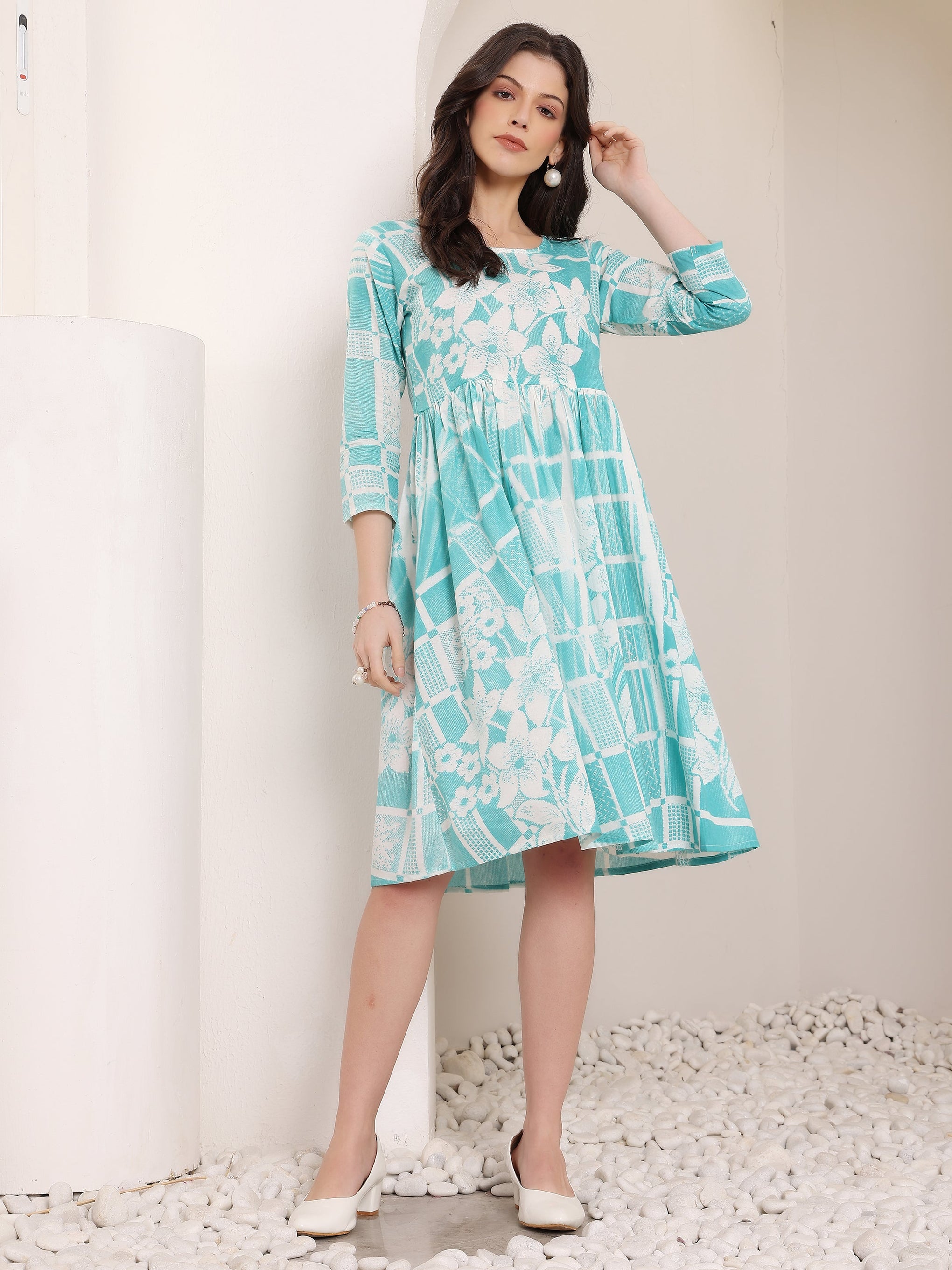 Add a touch of charm to your wardrobe with this Cotton Hand Printed Tiered A-Line Dress. Crafted from soft, breathable cotton, it features beautiful hand-printed motifs and a tiered A-line silhouette that offers a graceful and flowy look. Perfect for casual outings, brunches, or summer days, this dress blends comfort with effortless style.