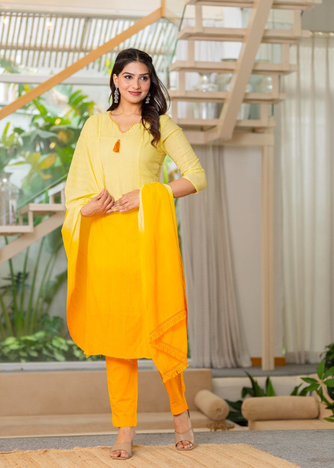 Elevate your ethnic wardrobe with this Cotton Dobby Ombre Effect Kurta Set, featuring a vibrant yellow kurta, straight pants, and a matching dupatta. Crafted from soft cotton with lining, it combines comfort and style effortlessly. The V-neck with delicate handwork and the subtle ombre effect make it perfect for festive occasions, casual gatherings, or day-to-day ethnic wear.