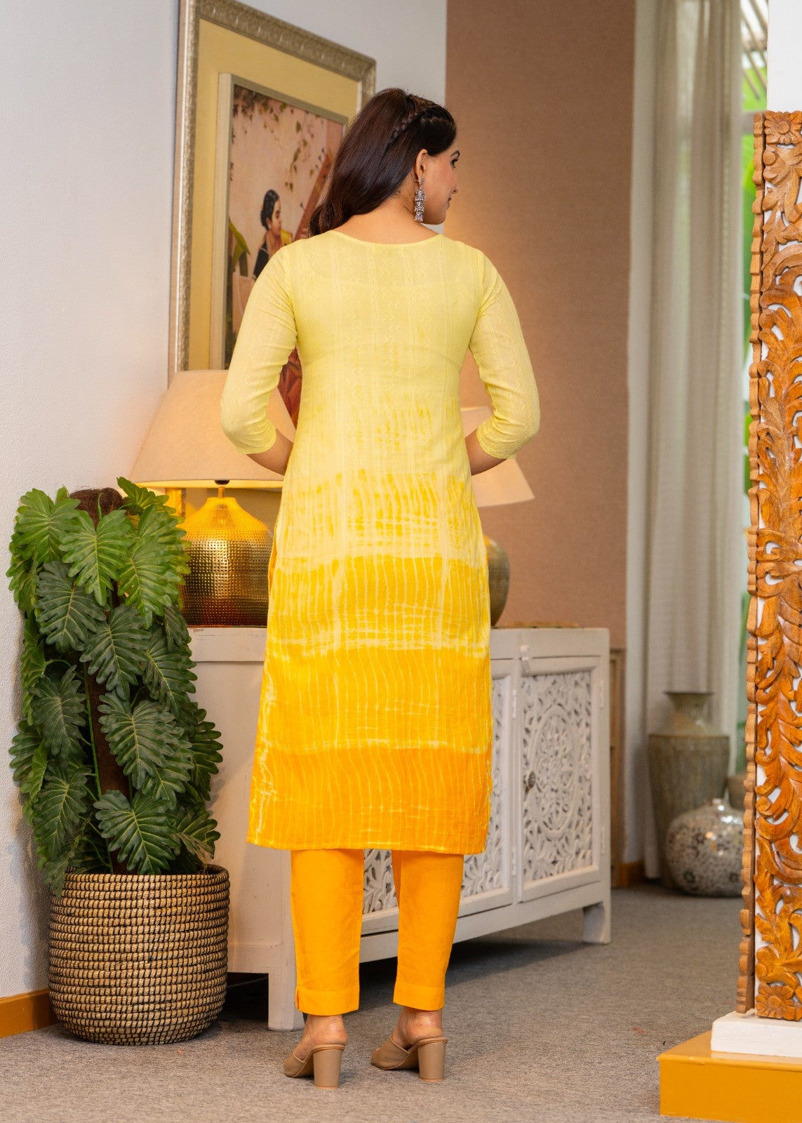 Step into effortless elegance with this Cotton Dobby Ombre Effect Kurta Set. Featuring a vibrant yellow kurta paired with straight pants and a matching dupatta, this ensemble combines traditional charm with contemporary style. The soft cotton fabric ensures comfort, while subtle handwork and an ombre effect add a touch of sophistication, perfect for festive occasions or casual gatherings.