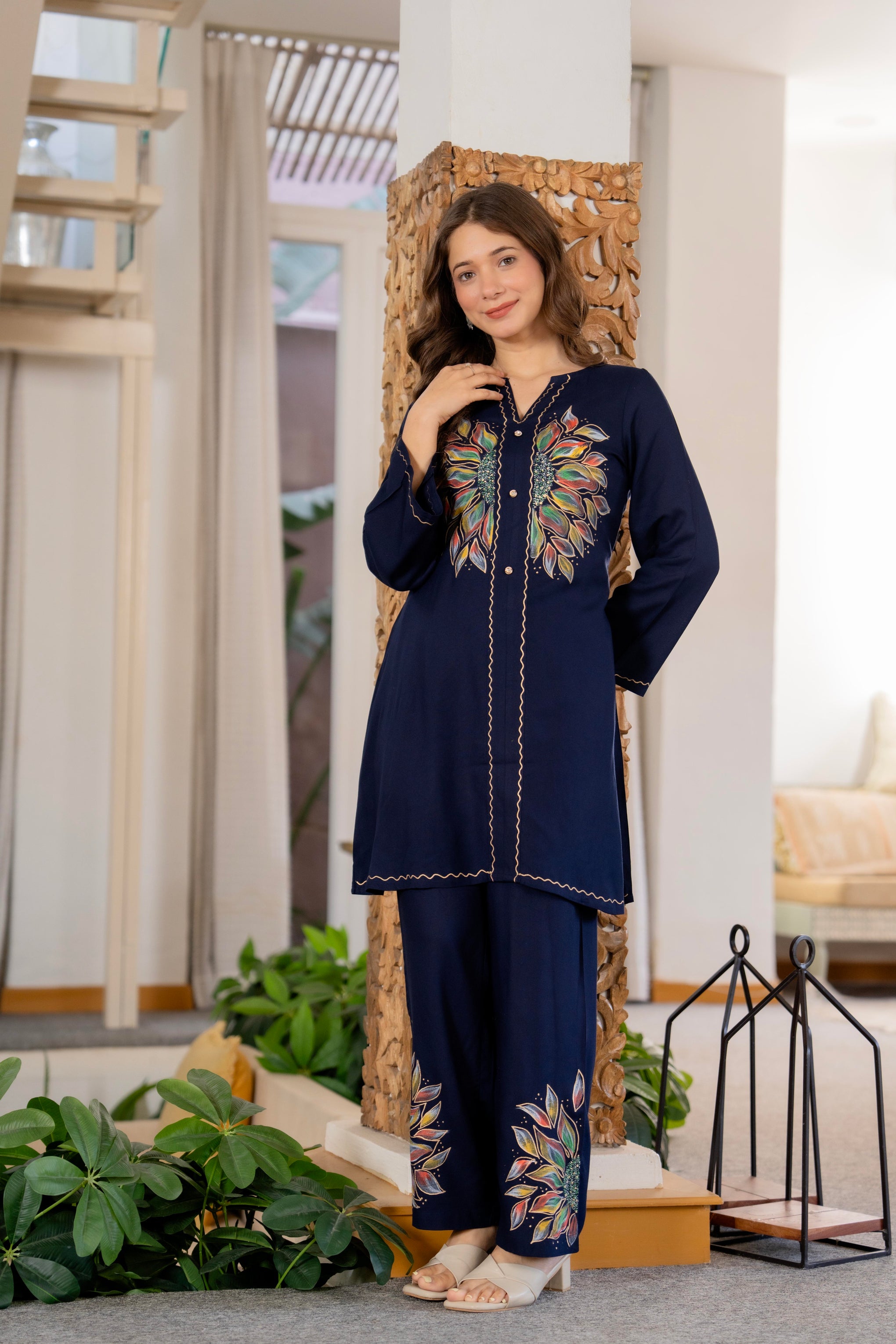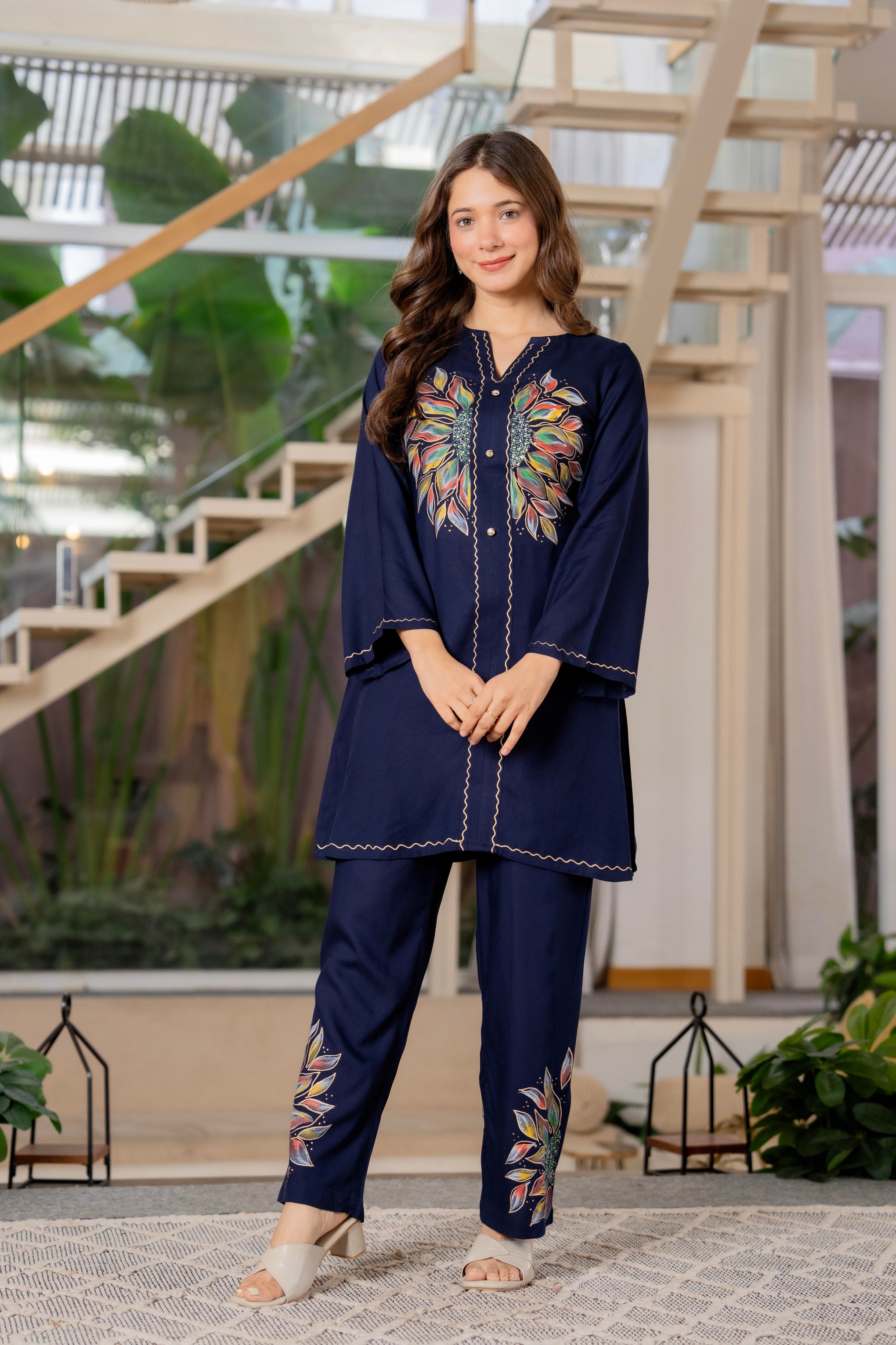 Elevate your ethnic style with this Women Rayon Brush Paint Pakistani Co-Ord Set in Navy. The kurta is crafted from soft rayon fabric, featuring a flattering V-neckline, three-quarter bell sleeves, and a buttoned placket for a polished look. Paired with a fully elastic belt pant, this set ensures comfort and ease of wear. The brush paint design adds a modern artistic touch, making it perfect for casual outings, office wear, or festive occasions.