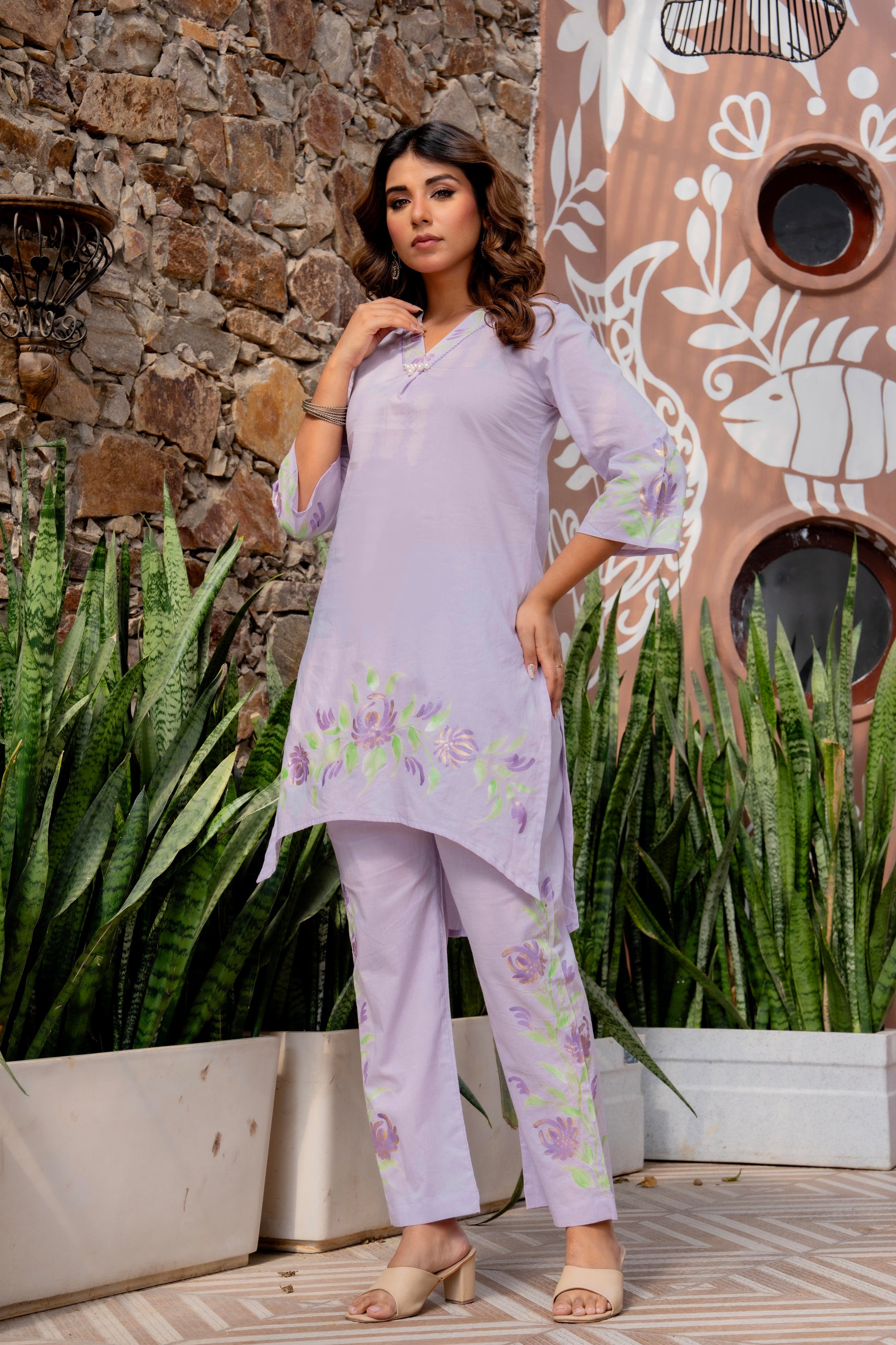 Stay effortlessly stylish with this Lavender Cotton Up & Down Co-ord Set. Designed in a trendy C-cut shape, the top features a flattering V-neckline, 3/4 regular sleeves, and elegant hand work on the neck. The unique brush-paint detailing adds a modern artistic touch. Paired with matching pants, this co-ord set offers comfort and contemporary style—perfect for casual outings, office wear, or day events.