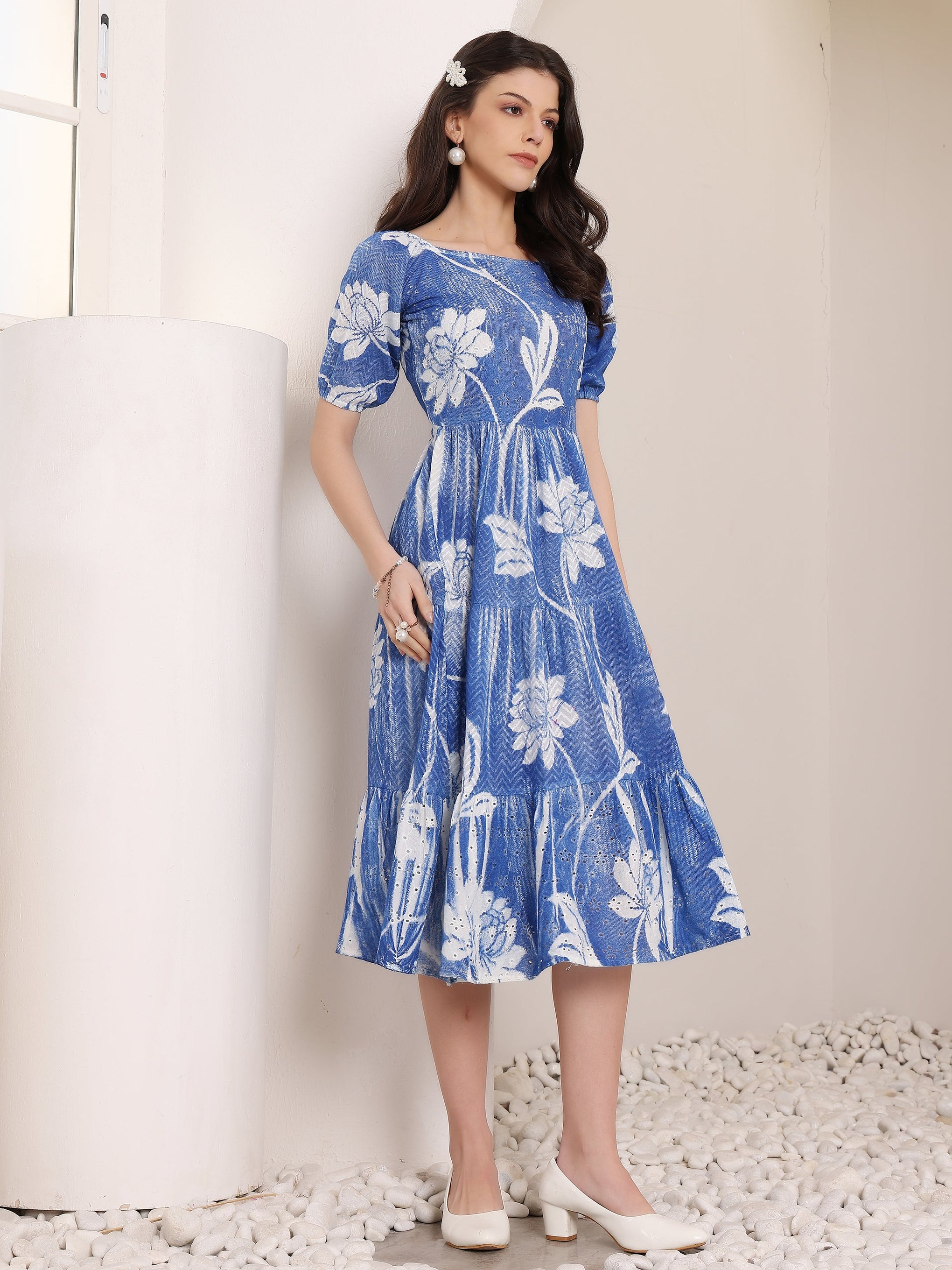 Refresh your wardrobe with this elegant Cotton Schiffli Hand Printed Knee Length Dress. Made from premium-quality cotton, it combines delicate Schiffli embroidery with artistic hand-printed motifs for a chic yet comfortable look. Perfect for casual outings, brunches, or everyday wear, this dress blends traditional charm with modern simplicity.