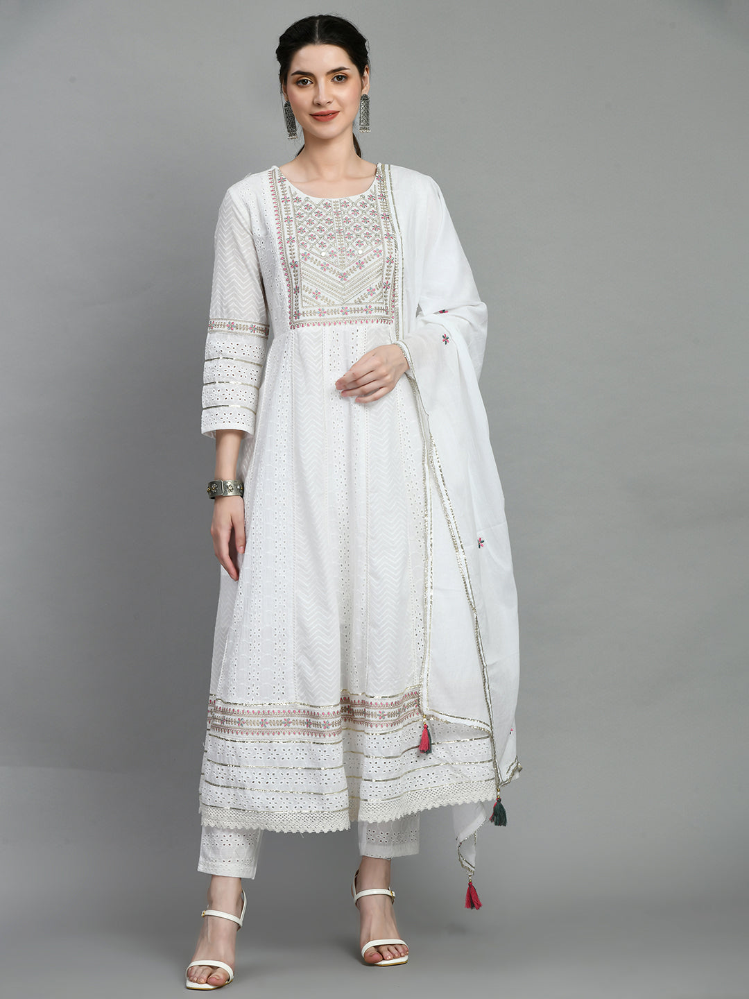 Cotton Schiffli Thread Work and Sequined Kurta, Pant and Dupatta