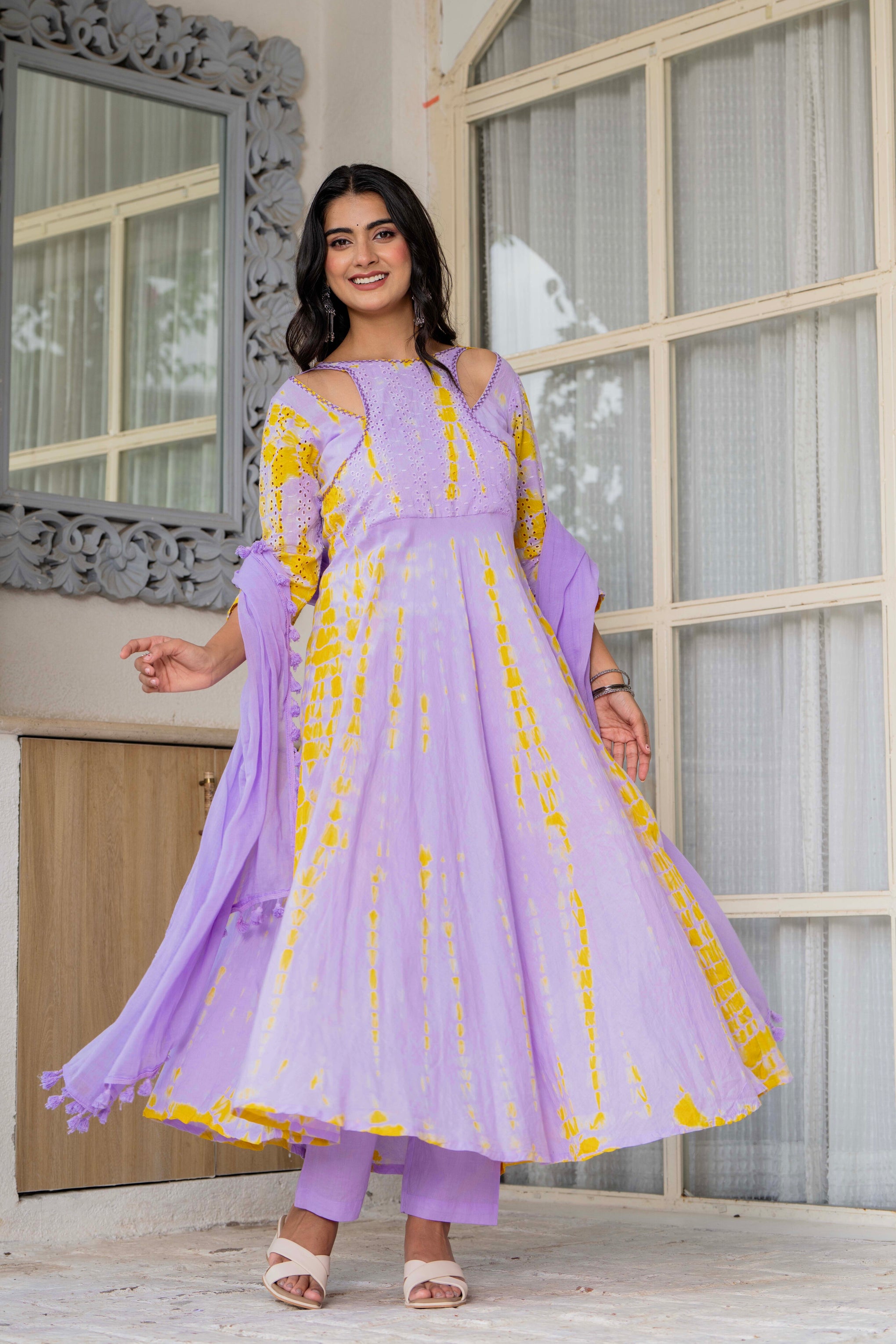 Women Tie& dye Mulcotton Anarkali Shape Kurta, Pant With Dupatta