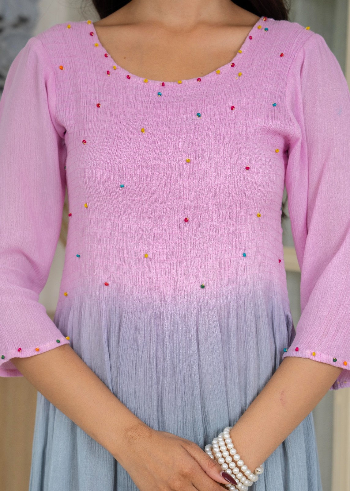 Step out in effortless elegance with this Rayon Crepe Smoking Maxi Dress. Crafted from soft, flowing rayon crepe, the dress features a smocked (smoking) bodice and a maxi-length silhouette for a flattering fit. Its lightweight and breathable fabric ensures all-day comfort while maintaining a chic, stylish look. Perfect for casual outings, brunches, or evening gatherings.