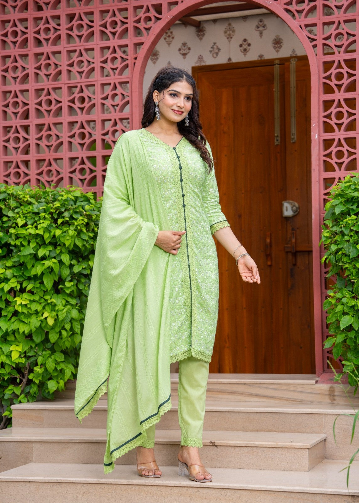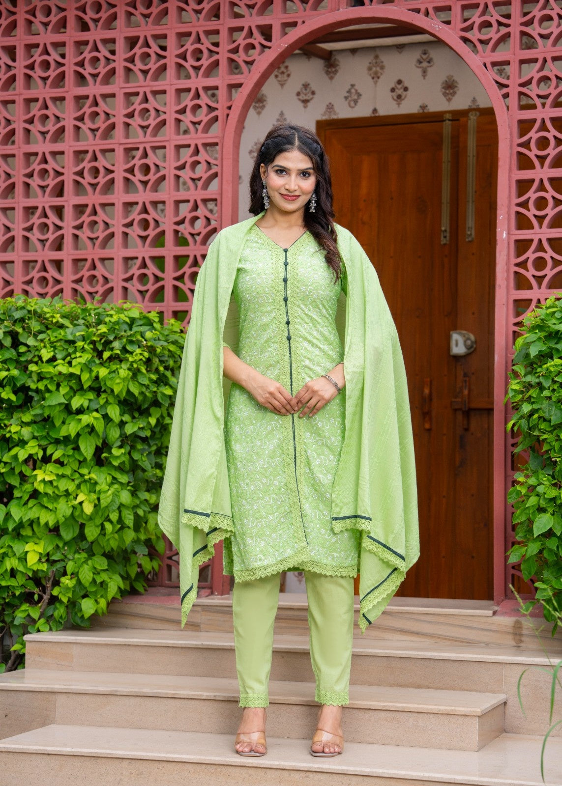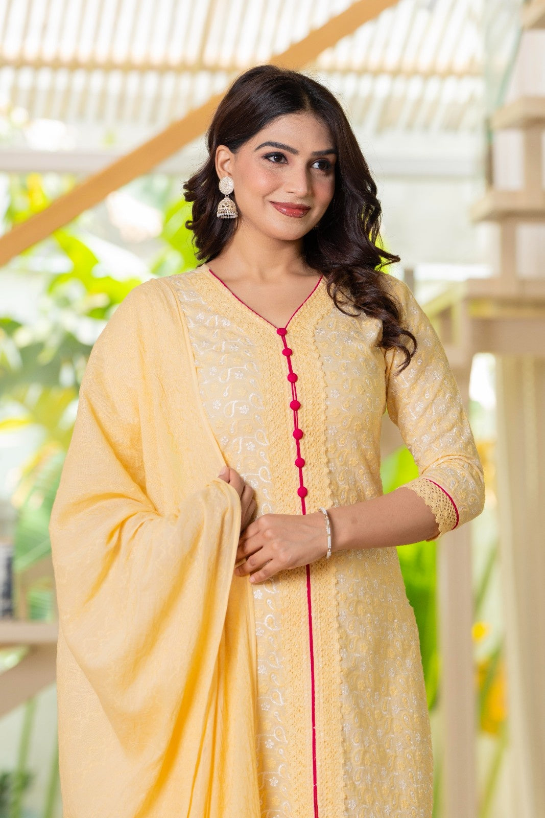 Cotton Schiffili Embroidered Kurta Pants and Dupatta