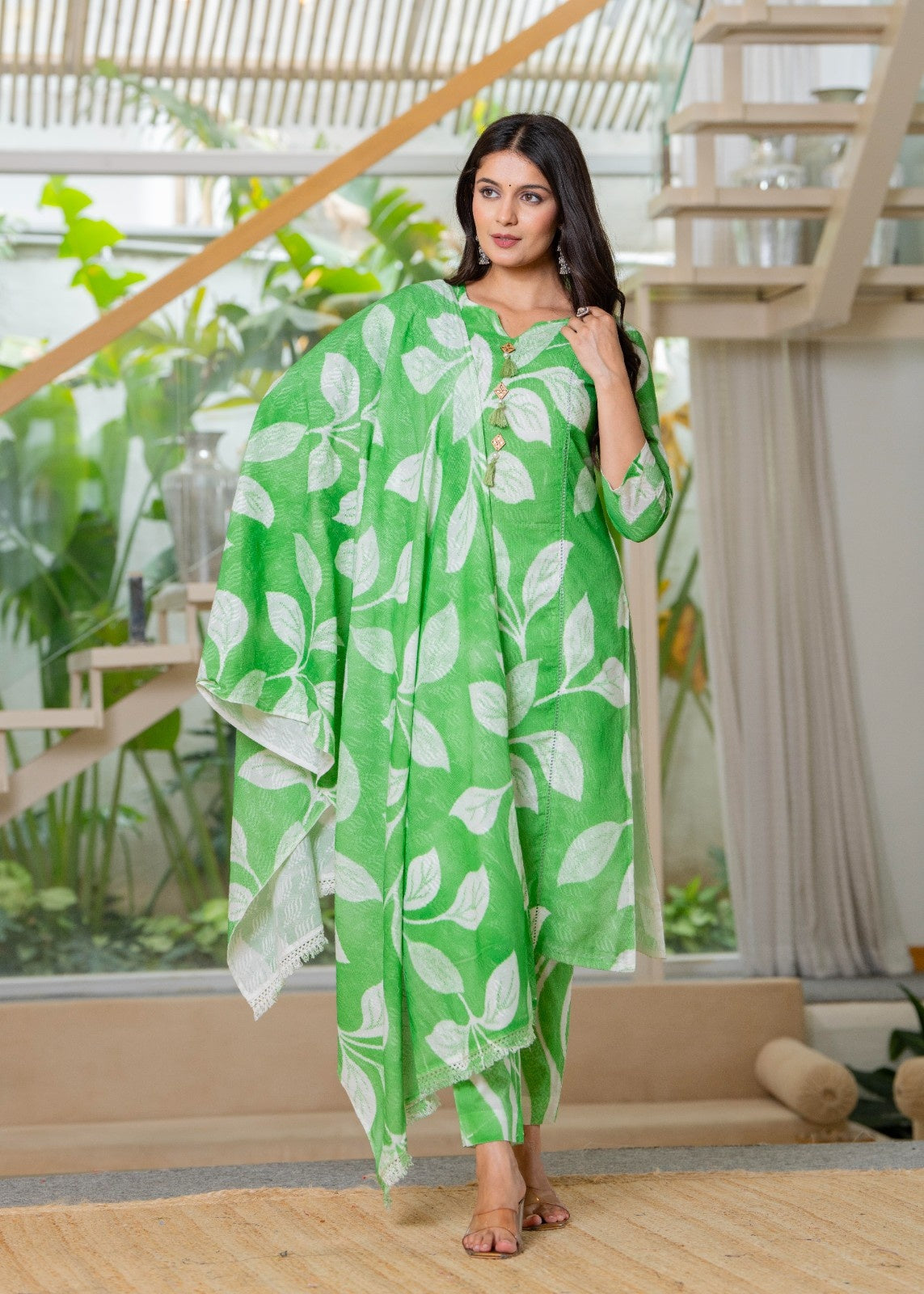 Bring a fresh and vibrant touch to your ethnic wardrobe with this Cotton Dobby Hand Printed Kurta Set in refreshing green. Crafted from soft cotton with lining, the set includes a straight kurta, matching pants, and dupatta, offering comfort with style. The V-neck features delicate handwork, while the hand-printed patterns add a unique artisanal charm, perfect for casual wear, festive occasions, or everyday ethnic styling.