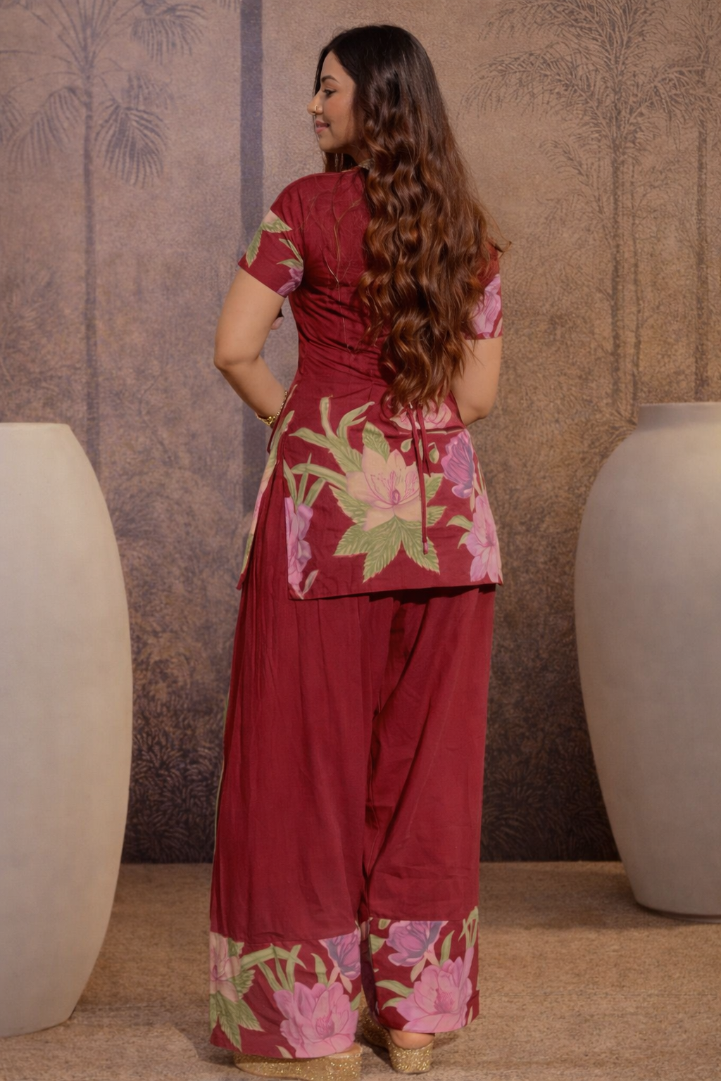 A graceful fusion of tradition and modern style, this deep maroon floral co-ord set radiates warmth and confidence. The soft sunlight highlights the rich hues and delicate floral prints, creating a timeless, elegant look perfect for festive days, casual outings, or intimate celebrations. Effortlessly chic with a touch of ethnic charm.