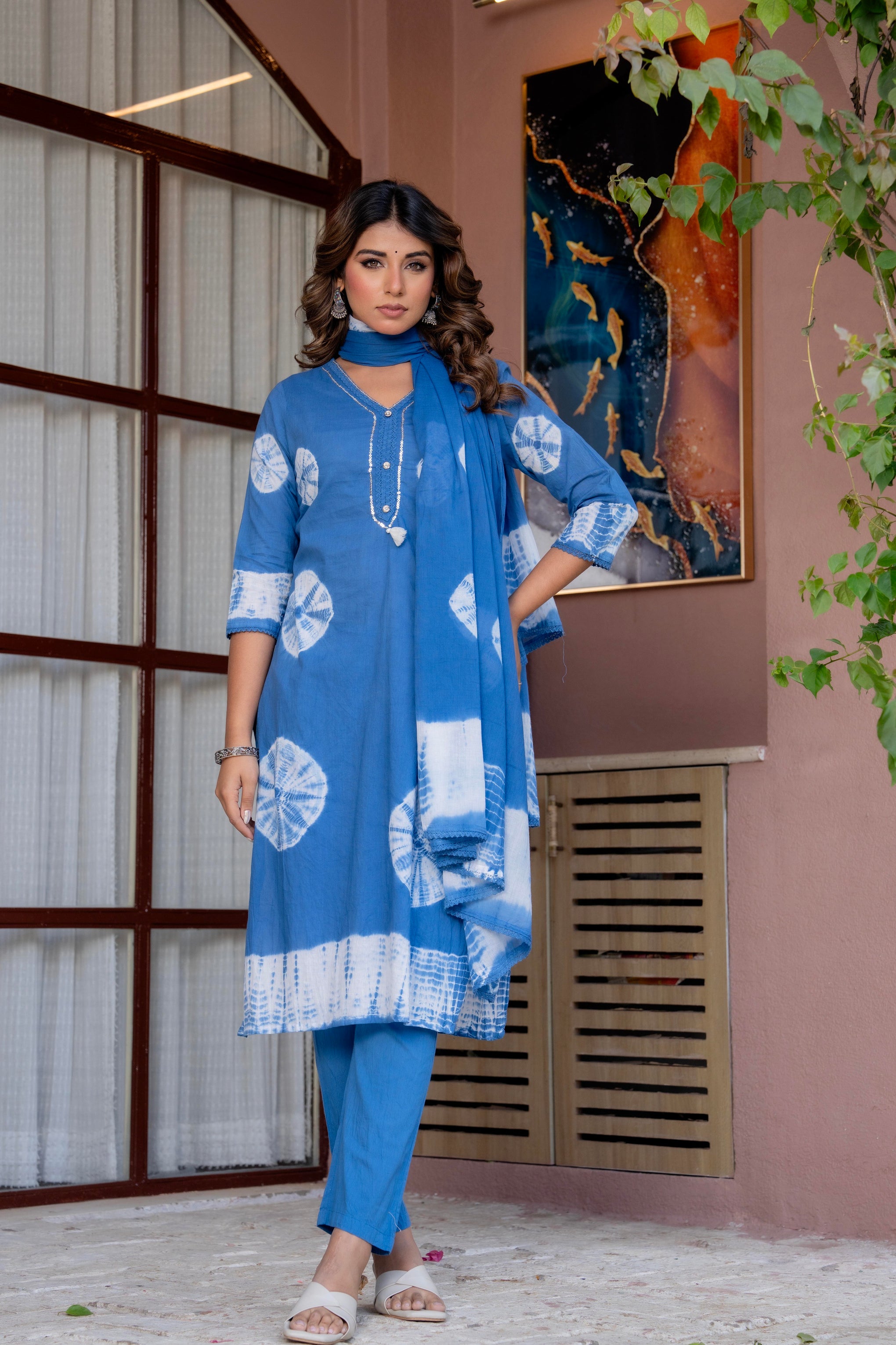 Add a stylish touch to your ethnic collection with this Blue Cotton Tie & Dye Straight Kurta Set. Designed with a flattering V-neck and 3/4 regular sleeves, the kurta features delicate hand-work detailing and a trendy tie & dye effect. The comfortable calf-length silhouette pairs perfectly with matching pants and a coordinated dupatta, making it an ideal choice for festive wear, casual outings, and everyday ethnic styling.