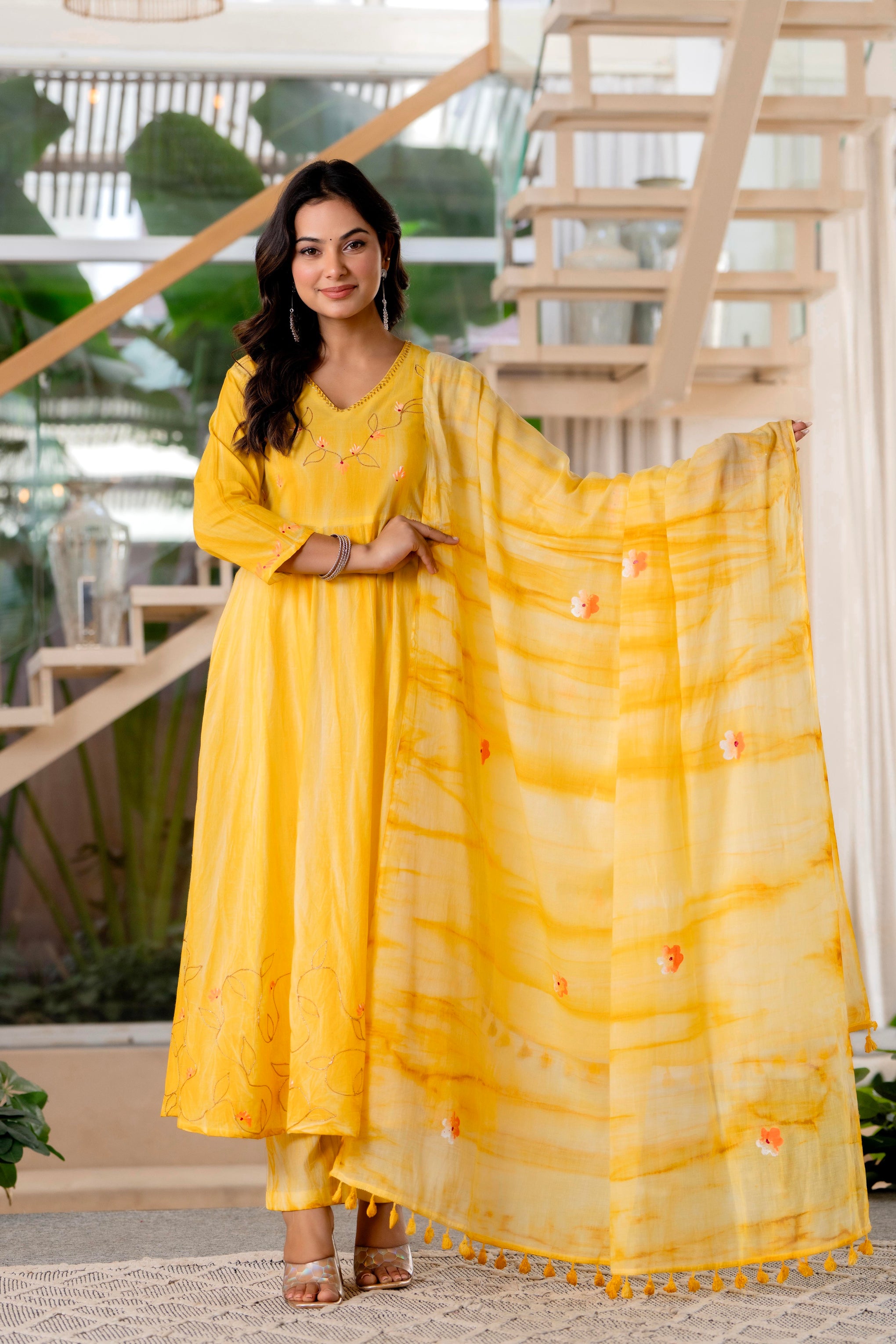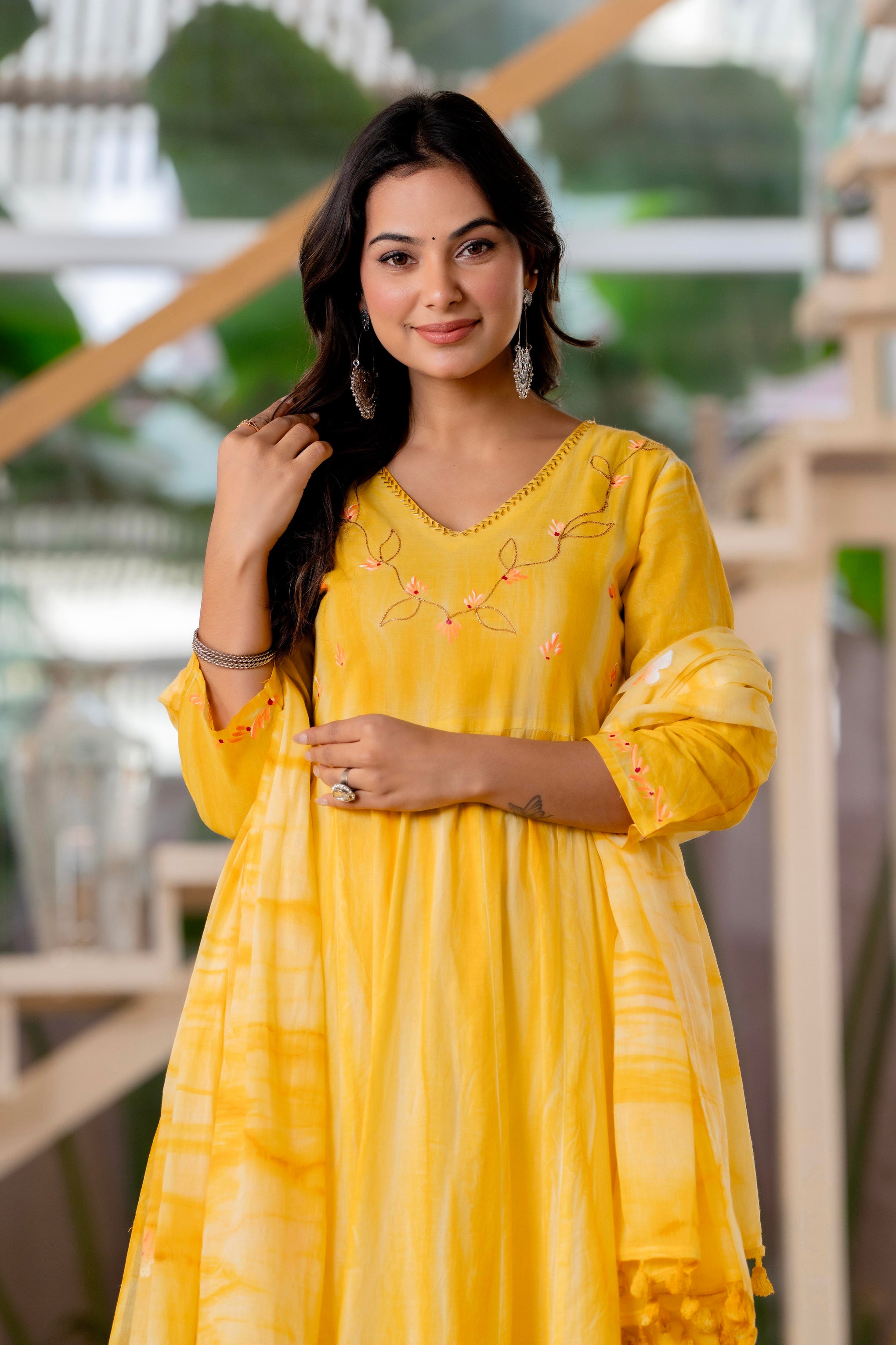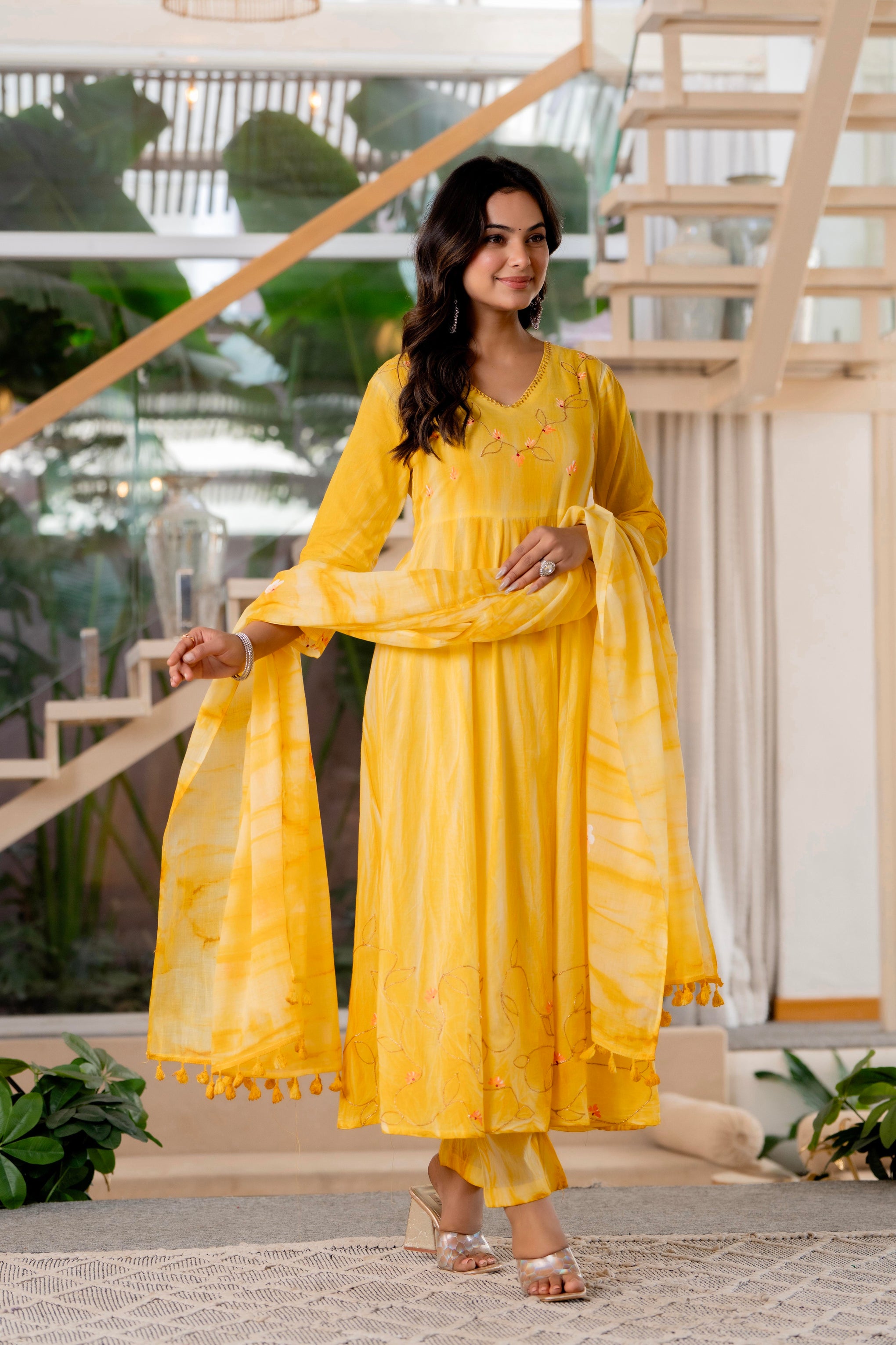 Women Yellow Tie&Dye and Manual embroidery Anarkali shape, kurta, pant & Duptta