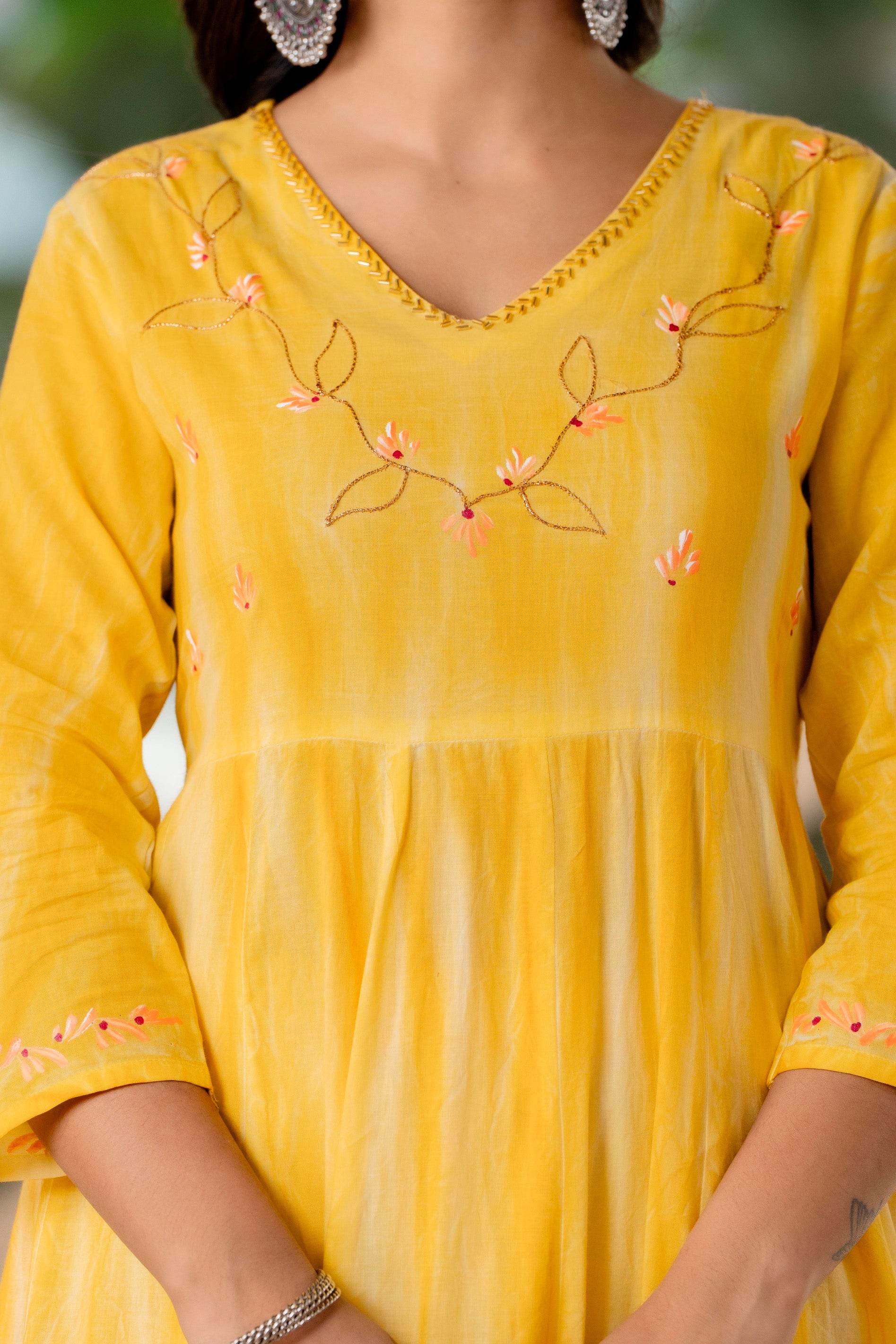 Brighten your ethnic wardrobe with this Yellow Cotton Tie & Dye Anarkali Kurta Set. Designed with a classic round neck and 3/4 regular sleeves, the kurta features intricate manual embroidery along with elegant hand-work detailing for a rich and festive look. The vibrant tie & dye effect enhances the graceful Anarkali silhouette, giving it a lively and traditional appeal. Paired with matching pants and a coordinated dupatta, this calf-length set is perfect for festive celebrations, family gatherings, and cultural events.